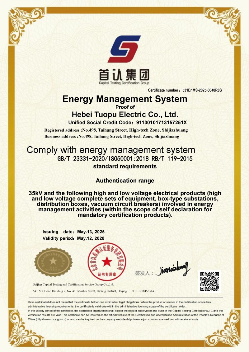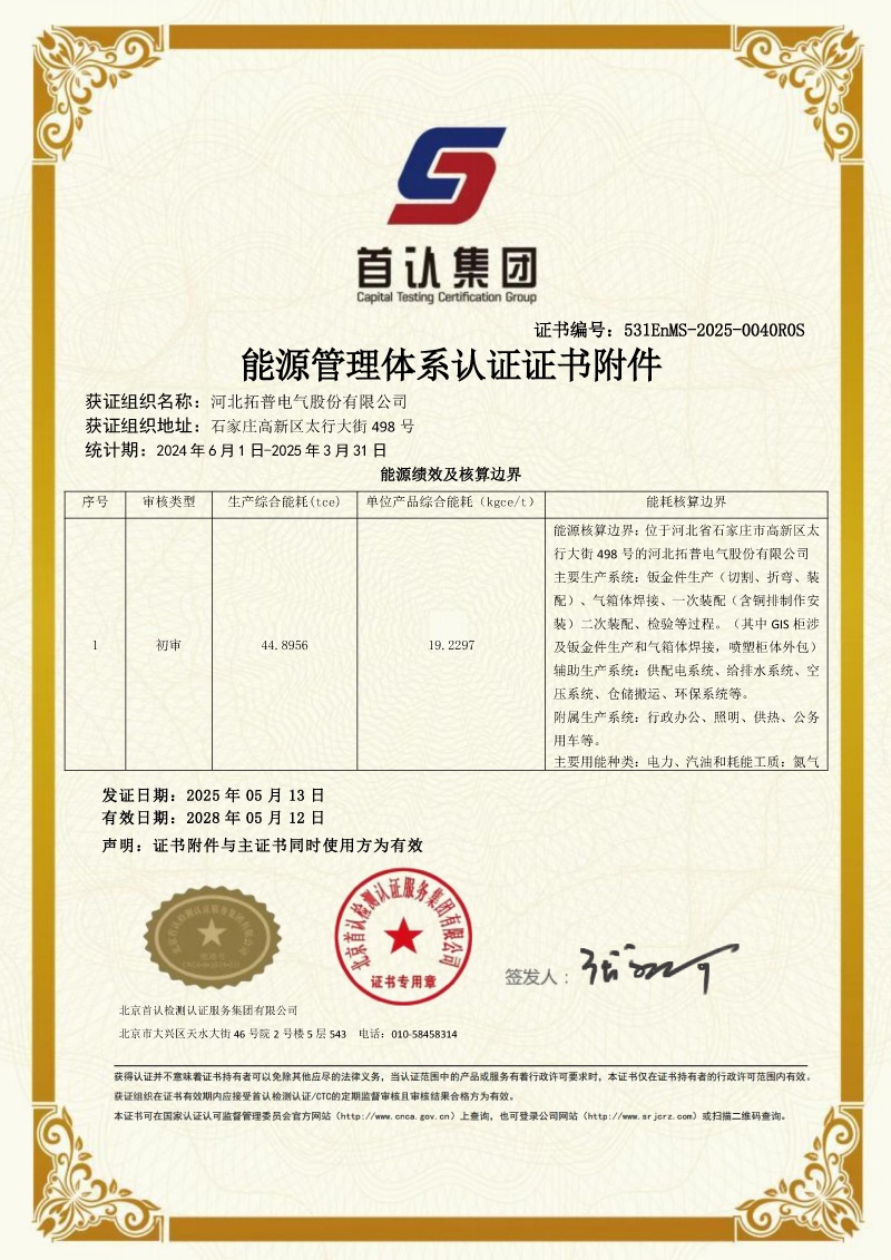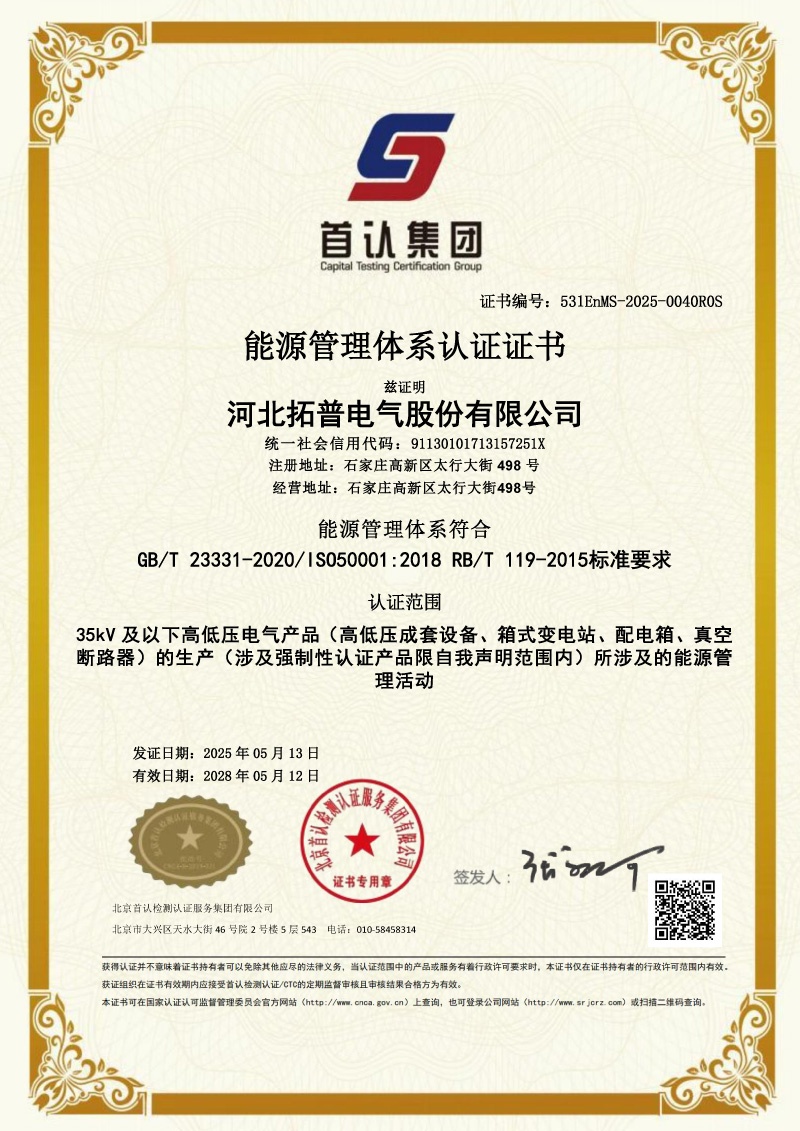 近日,我司—— 河北拓普電氣股份有限公司憑借完善的能源管理體系建設(shè)、卓越的能源管控能力以及全員參與的節(jié)能降耗實(shí)踐,順利通過北京首認(rèn)檢測認(rèn)證服務(wù)集團(tuán)有限公司的嚴(yán)格審核,正式獲得能源管理體系認(rèn)證證書!這一認(rèn)證的取得,標(biāo)志著我司在能源管理標(biāo)準(zhǔn)化、規(guī)范化、系統(tǒng)化建設(shè)方面邁出了堅(jiān)實(shí)一步,更是我司踐行綠色發(fā)展理念、推動(dòng)可持續(xù)發(fā)展的重要里程碑!